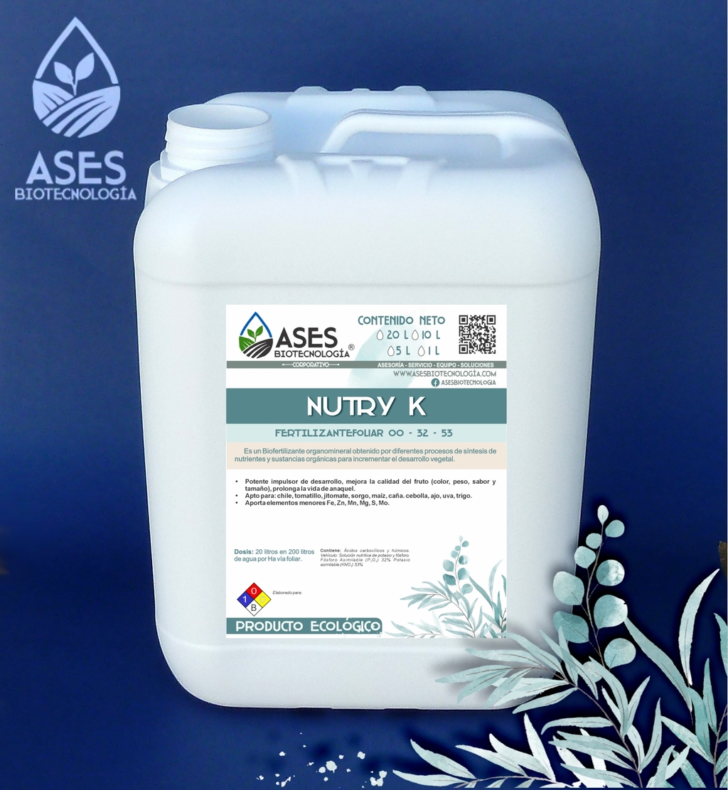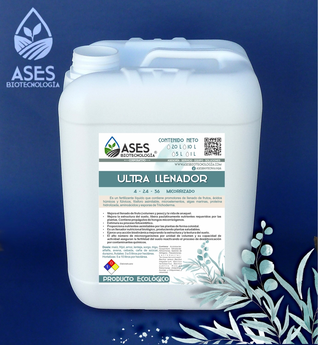 Es un fertilizante líquido que contiene promotores de llenado de frutos, ácidos húmicos y fúlvicos, fósforo asimilable, microelementos, algas marinas, proteína hidrolizada, aminoácidos y esporas de Trichoderma.